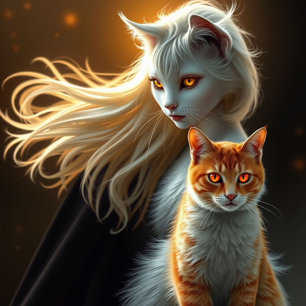 A digital rendering of a female white cat witch with flowing golden-white hair and honey amber eyes reminiscent of the afternoon sun, exuding an aura of authority within her mystical realm. Beside her stands her enigmatic companion, a striking ginger cat with fiery red eyes, exuding the intensity of a wildfire, their silhouettes outlined in a shared monochromatic fur ensemble. The scene captures the detailed texture of their fur in high definition, enveloped in ambient light and subtle volumetric lighting that adds depth to their magical surroundings.