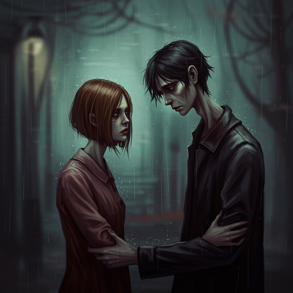 A digital wallpaper capturing a memory of love, washed in muted colors, with a dramatic and nostalgic composition. The digital painting evokes a rainy atmosphere, leaving an emotionally profound, haunting impression on the psyche. The artwork is unforgettable and intricately detailed, inspired by the styles of Milo Manara and Russ Mills. It conveys a sense of melancholy and beauty, despite being rendered in low quality with jpeg artifacts. The piece features imperfect anatomy with distorted and deformed figures—elongated necks, misplaced limbs, and exaggerated proportions—that create a surreal and unsettling yet evocative image. The background is blurred and indistinct, suggesting a faded memory. Despite this, the essence of the remembered love remains compelling and timeless.