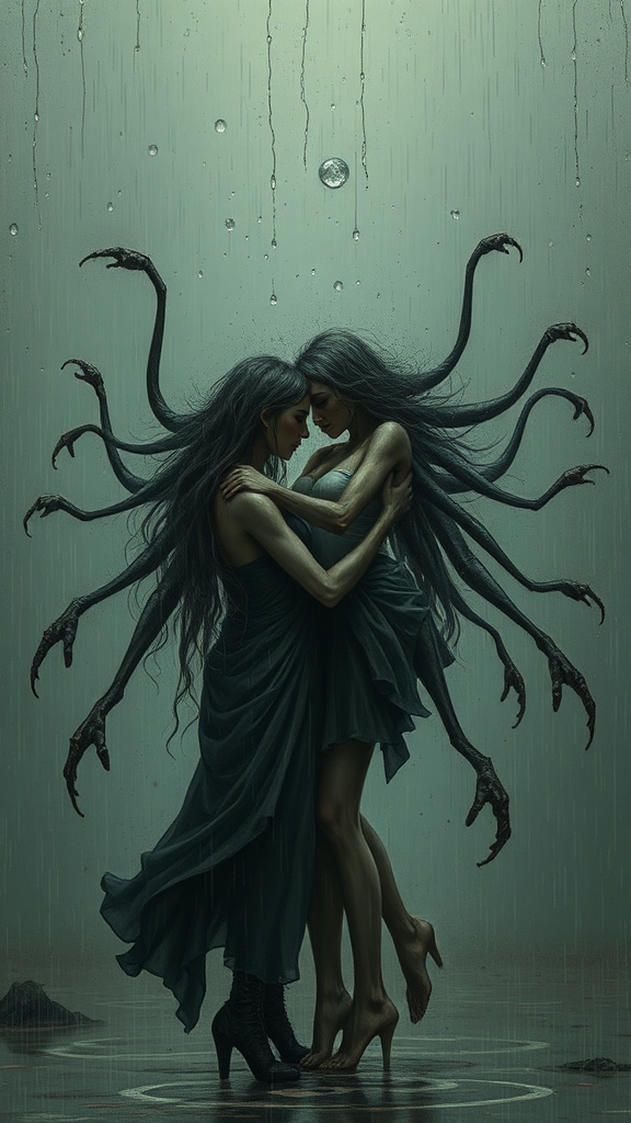 a digital wallpaper capturing the essence of "I remember the time we were in love" with muted colors and a dramatic composition. The piece evokes nostalgia, akin to a digital painting set in a rainy environment, infusing an emotionally profound and haunting atmosphere that leaves an indelible impression on the psyche. The artwork is intricate and reminiscent of the styles of Milo Manara and Russ Mills. Though intended to convey deep emotion, the execution involves elements of distortion, such as poorly drawn features, mutated and deformed anatomy, and oddly proportioned limbs. The overall scene is a chaotic mix of extra limbs and disfigured features, creating a jarring yet unforgettable vision, featuring long necks and missing or extra body parts. The imagery suggests a blend of love’s beauty and its haunting aftermath, capturing a sense of time’s passage and emotional complexity against a dreary, rainy backdrop.