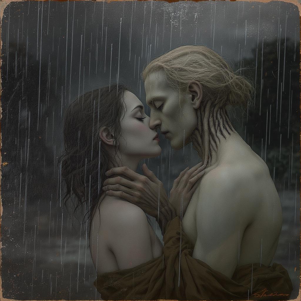 A digital wallpaper capturing the nostalgic essence of a time when we were in love; featuring muted colors and a dramatic composition. This digital painting echoes a rainy, emotionally profound atmosphere that leaves an indelible and haunting impression on the psyche. The artwork is unforgettable and intricately detailed, inspired by the styles of Milo Manara and Russ Mills. It portrays a sense of nostalgia and emotional depth, though intentionally includes elements of imperfection such as low quality and jpeg artifacts to evoke a raw, textured feel. The piece explores themes of beauty in imperfection with aspects like poorly defined anatomy, exaggerated proportions, and distorted features, adding a surreal and morbid layer to the emotional landscape. Memories are depicted through deformed and disfigured elements, incorporating unusual proportions, missing or extra limbs, extended necks, and other haunting characteristics, all blending into a work of art that is as mesmerizing as it is unsettling. No text overlays or watermarks interrupt the piece, allowing it to speak purely through its composition and emotional depth.
