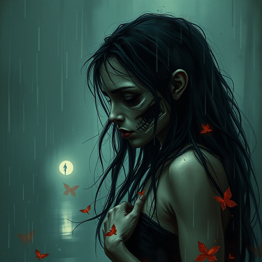 a digital wallpaper depicting a time of love remembered, using muted colors and a dramatic composition to evoke nostalgia through digital painting; a rainy and emotionally profound scene that leaves a haunting impression, intricately crafted in a style reminiscent of Milo Manara and Russ Mills, evoking unforgettable memories; the artwork is depicted in a low-quality, flawed manner with intentional imperfections like jpeg artifacts and unusual anatomical features, reflecting an abstract and distorted portrayal with poorly defined forms, creating a sense of disfigurement and surreal proportions that emphasize the morbid and haunting essence of the memory.