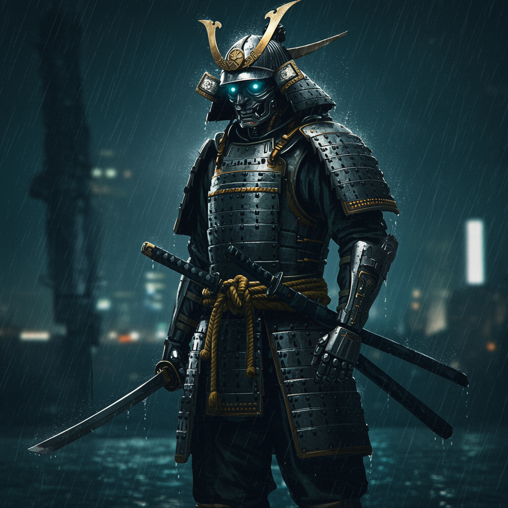 A digital wallpaper featuring a fierce cyborg samurai clad in intricate cyberpunk armor, standing alone amidst a rainy night. This epic scene is illuminated by glowing elements on the armor, creating a dramatic and emotionally profound atmosphere. The samurai strikes a proud, fearless pose, rendered in a painting style reminiscent of the works of Milo Manara and Russ Mills. The dramatic lighting enhances the depth and intensity, creating an unforgettable image. The attention to detail captures the very essence of a futuristic warrior, while avoiding any artistic flaws or distortions. The composition is skillfully designed to highlight the elegance and complex detail of the armor, ensuring a visually stunning piece devoid of any imperfections or distractions such as artifacts, deformities, or extraneous elements.
