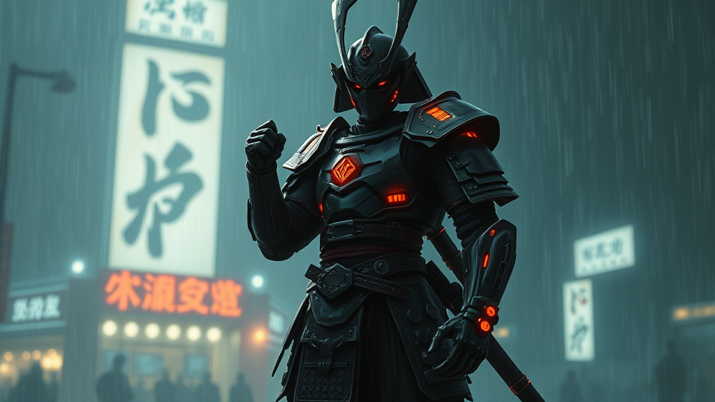 A digital wallpaper featuring a formidable cyborg samurai clad in cyberpunk armor, standing alone amidst a rainy night, exuding an aura of confidence and fearlessness. The protagonist strikes a proud pose, their intricate armor adorned with glowing elements that reflect the dramatic lighting of the scene. The atmosphere is emotionally profound, creating an epic and unforgettable visual experience. The painting style is reminiscent of the detailed work of Milo Manara and Russ Mills, capturing intricate details with exceptional precision. The composition is expertly crafted, showcasing impeccable anatomy and proportions, ensuring a visually striking and captivating image.