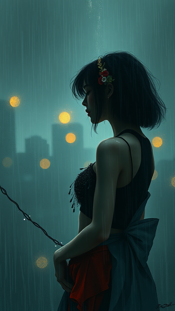 A digital wallpaper inspired by memories of love, featuring muted colors and a dramatic composition that evokes nostalgia. The scene is a digital painting set in the rain, conveying deep emotions and leaving a lasting haunting impression on the viewer's mind. Drawing inspiration from the artistic styles of Milo Manara and Russ Mills, the artwork is intricate and unforgettable. Despite elements of distortion, the composition remains poignant and evocative, with subtle imperfections that add to its emotional depth.