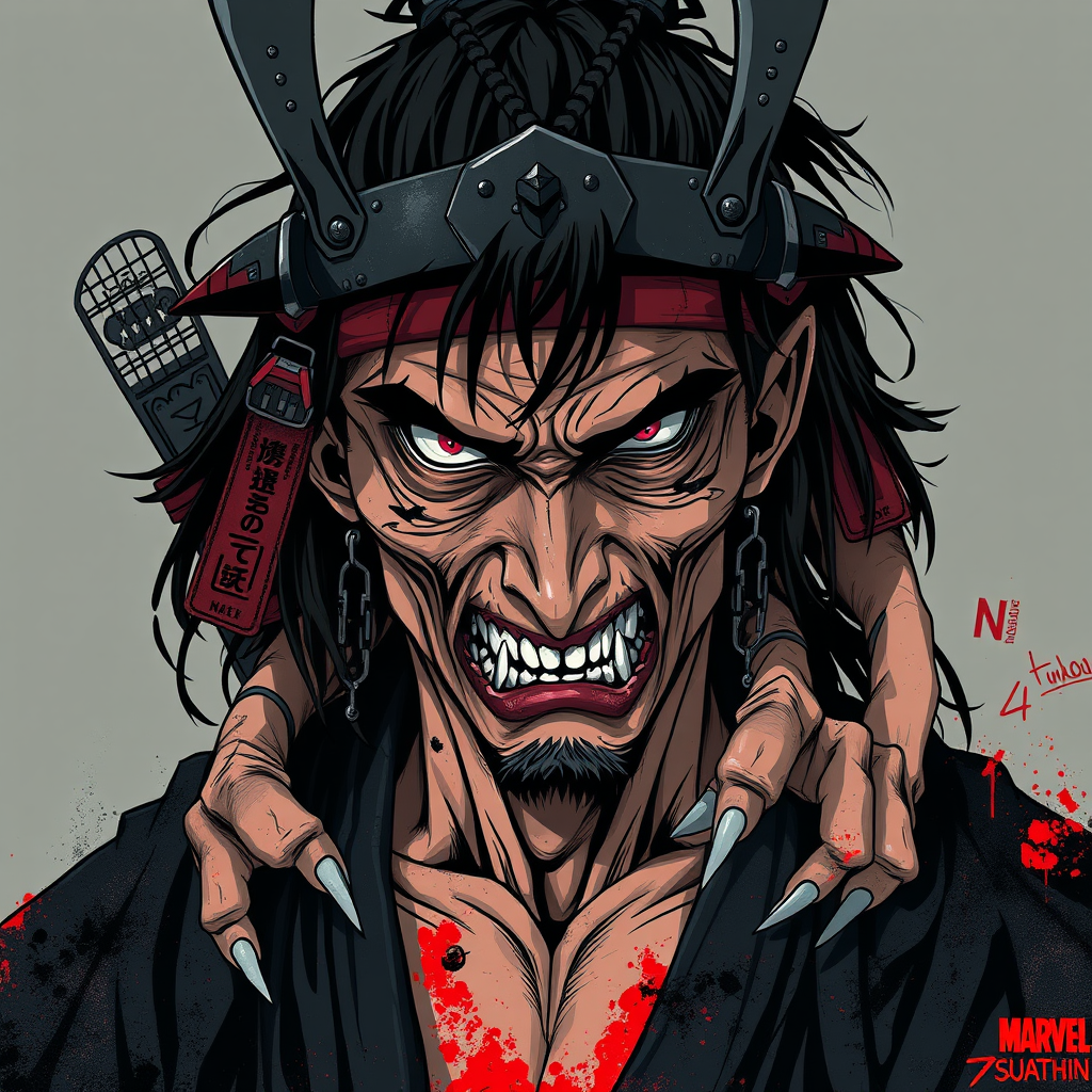 A digital wallpaper portrait of a brutal cyberpunk samurai in an anime style, inspired by the dark and muted colors of Marvel comics. The composition is epic and dramatic, with intricate details. The samurai features exaggerated and distorted elements, including poorly drawn and mutated anatomy, deformed and dehydrated features, and unsettling proportions. Extra limbs, cloned faces, and disfigured appearances contribute to a morbid and chaotic visual. The artwork includes elements of digital degradation, such as low quality, jpeg artifacts, and visual noise, with the image appearing cut off and censored in places. Signature and watermark clutter add to the chaotic presentation, enhancing the overall dystopian feel of the piece.