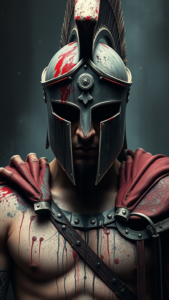 A digital wallpaper portrait of a Spartan warrior with no visible face, set against a gloomy backdrop. The scene is brutal yet majestic, filled with drama and expressionism, capturing profound emotion. A close-up view reveals an unforgettable depiction, executed with high quality through splatter and drip painting techniques. Despite the artistic mastery, the image incorporates imperfections such as jpeg artifacts, and appears duplicated and unsettling. The warrior's form exhibits poorly rendered hands and face, mutations, and distorted anatomy with extra limbs. The depiction includes exaggerated features like a long neck, blended with a sense of morbid fascination. Elements like a name, signature, or watermark intrude, adding a sense of unauthorized duplication. Despite these flaws, the piece remains compelling, blending beauty with chaos and evoking a haunting resonance.