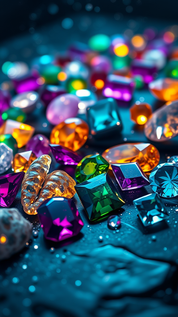 A digitally enhanced image of a dazzling assortment of gemstones, creating an enchanting and opulent scene. The gemstones radiate an inner luminescence, casting vivid reflections and refractions over a sleek black surface reminiscent of polished obsidian. Each gem emits a mystical aura, with ethereal tendrils of light swirling gently around them. The atmosphere is enriched by shimmering micro-crystals suspended in the air, evoking a sense of a magical treasure trove. The scene feels otherworldly, with a vibrant color palette that accentuates the deep hues of the jewels and contrasts beautifully with the dark backdrop.