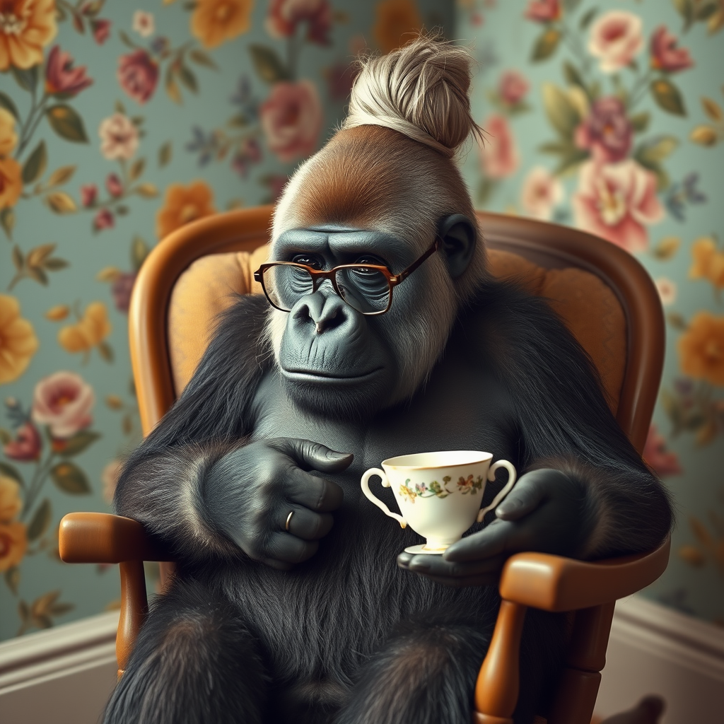A dignified gorilla with silver-streaked hair elegantly tied in a bun, wearing vintage spectacles, sits contentedly in a cozy rocking chair. The room is enveloped in vibrant floral wallpaper that complements the tranquil scene, as the gorilla delicately holds a porcelain teacup. Soft, warm lights cast a gentle glow, enhancing the peaceful ambiance.