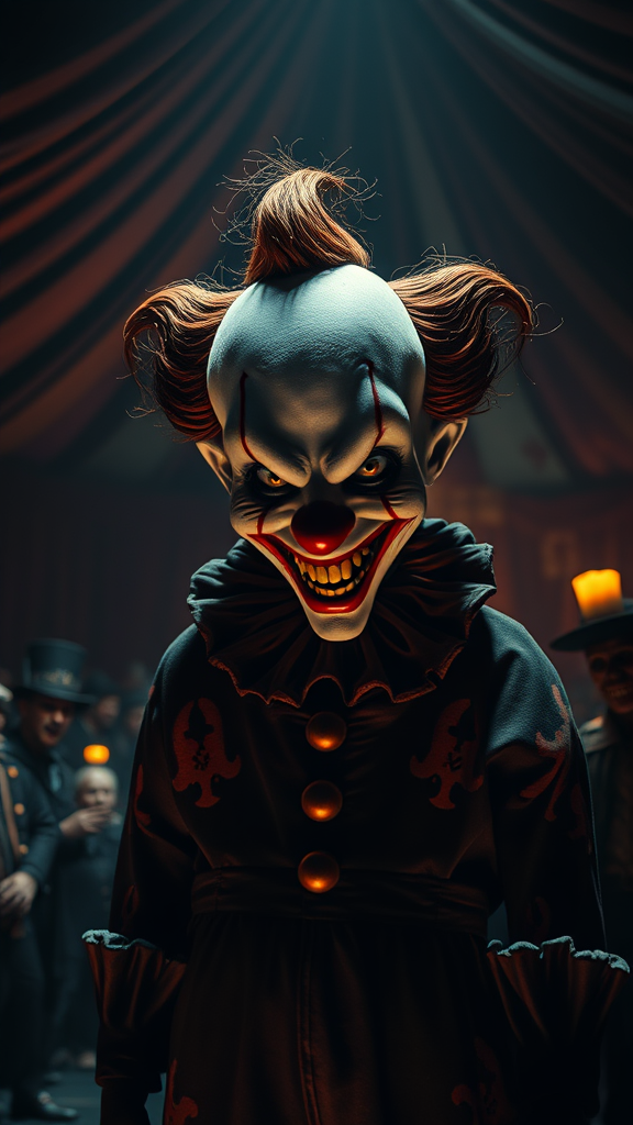 A diminutive, sinister clown with a chilling grin stands amidst a shadowy, grotesque circus performance, enveloped in an atmosphere of horror and darkness. The scene is detailed with intricate designs, captured under dramatic lighting that highlights the malevolent features of the clown's face. The photorealistic, cinematic quality of the image, accentuated by subtle cinematic noise, draws the viewer into the unsettling world. The circus tent looms behind, filled with eerie shadows and macabre curiosities, enhancing the nightmarish allure of the spectacle in stunning 8k resolution.