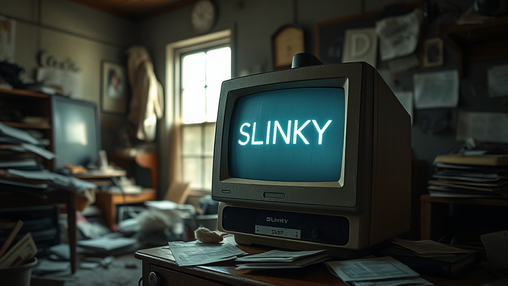 A dimly lit, cluttered room with an old, dusty CRT monitor as the focal point, resting on a wooden desk surrounded by scattered papers and miscellaneous objects. The monitor's surface is worn, with a few subtle scratches and a layer of dust, displaying the word "SLINKY" in a softly glowing, vintage typeface. The room is filled with a sense of neglect, with faint rays of light filtering through a small window, casting muted shadows that play upon the walls. The depth of field emphasizes the monitor, while the surrounding environment blurs into the background, hinting at a narrative of forgotten technology among the chaos.