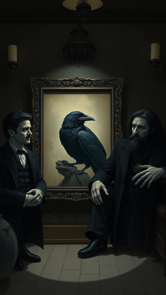 A dimly lit room houses a portrait of a raven alongside figures resembling Edgar Allan Poe and H. P. Lovecraft, each exuding an air of brooding introspection. They are captured in a digital illustration with intricate detailing on their clothing and faces. The art style draws inspiration from Edward Gorey, Tim Burton, and Mike Mignola, resulting in a blend of gothic sensibilities with a muted, subdued color palette. Shadows dance around, adding depth and mystery to the scene, while the atmosphere remains enveloped in a timeless, eerie ambiance that resonates with the classic allure of gothic literature.