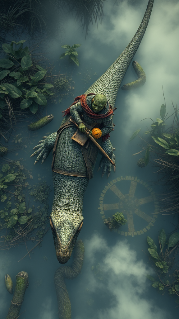 A direct overhead aerial view captures a cinematic scene inspired by Dungeons & Dragons, where a goblin rides a monstrous reptile through a mystical wetland. The lizard is adorned with subtly colored scales, intricate armor, and a detailed saddle, accurately sized to its environment. Surrounding the creatures, the wetland unfolds in a palette of muted hues, revealing dense vegetation, misty waters, and an ethereal smoky ambiance. The scene, viewed from directly above, highlights the goblin's small yet proportionate stature, enhancing the epic fantasy atmosphere. Subdued lighting casts a soft glow over the landscape, emphasizing textures and details of the swamp, lizard, and goblin, while maintaining a cinematic feel.