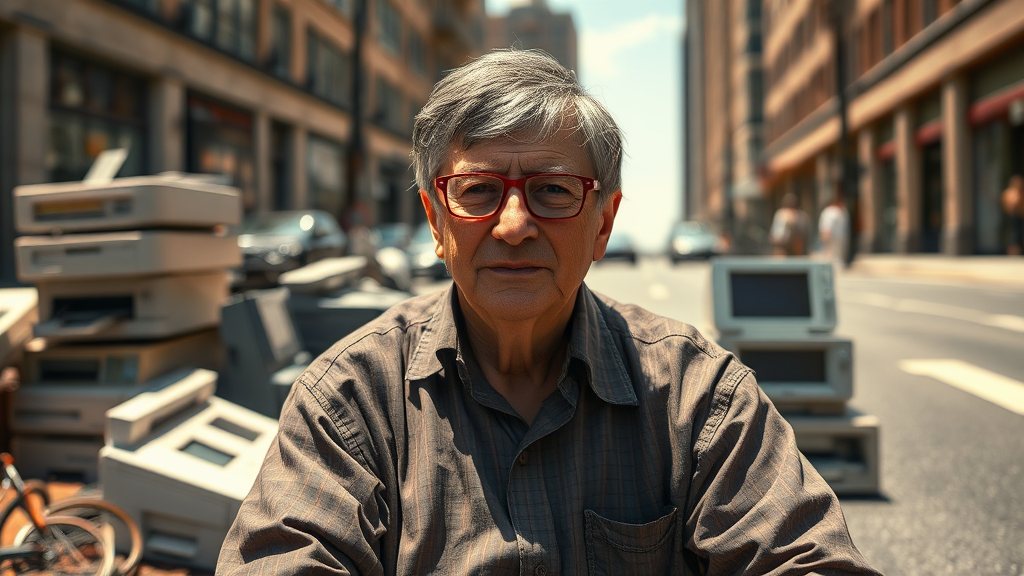 A disheveled Bill Gates sits on a sunlit city street, looking worn and weary in tattered, dirty clothes with holes. His signature red glasses are held together with tape. Beside him lies a pile of outdated computers and printers, remnants of a bygone era. The scene is captured through a Canon EOS Rebel SL2 using an EF100mm f/2.8L Macro IS USM lens, set at f/2.8, 100.0 mm, and 1/1000 shutter speed, highlighting the gritty textures and somber hues of this unexpected moment.