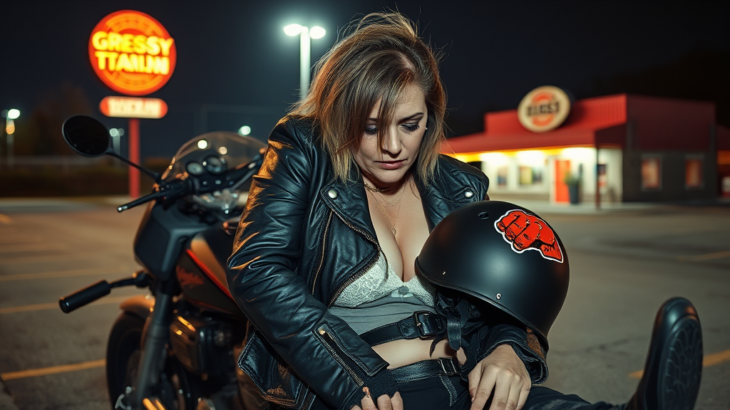 A disheveled middle-aged British woman, sporting a rebellious punk aesthetic, slumps against the worn hood of a bike, her messy hair hanging in front of her blotchy face, eyes dull with boredom beneath heavy eyeliner. A faded black leather jacket, mangled at the sleeves, rides up her arms, revealing the frayed edges of a white lace bra underneath. She's clad in scuffed black combat trousers, buckled with rusty silver belts, and scuffed up black leather boots, jammed into the pavement's corner, as if she's been there for a while. A black helmet leans against the backrest of the bike, adorned with a snarling sticker of a fist, adding a splash of color to the drab scene. Beyond her stands a faintly lit parking lot of a small, greasy-spoon restaurant, filled with late-night patrons and flickering streetlights that cast long shadows across her face.