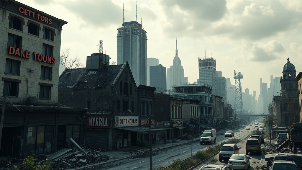 A distant perspective of a city ravaged by a relentless zombie horde, emphasizing derelict stores, crumbling houses, and towering buildings, reminiscent of Detroit's architectural landscape, rendered in Unreal Engine 5 with an upscaled, ultrarealistic quality in 8k resolution, capturing an eerie, post-apocalyptic atmosphere where nature starts reclaiming urban ruins and the chilling silence is occasionally broken by distant echoes.