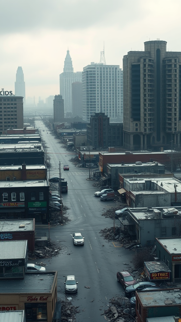 A distant view of a city ravaged by a relentless swarm of zombies, showcasing a hauntingly desolate landscape of stores and residential houses, alongside the hollow shells of towering buildings, set in a post-apocalyptic Detroit. Rendered using Unreal Engine 5, the scene is captured in ultra-realistic detail, emphasizing the eerie emptiness and chaotic decay, depicted in stunning 8k resolution. Subtle creative elements like graffiti, shattered windows, and overturned vehicles add to the narrative of desperation and survival, enhancing the immersive experience of this forsaken urban expanse.