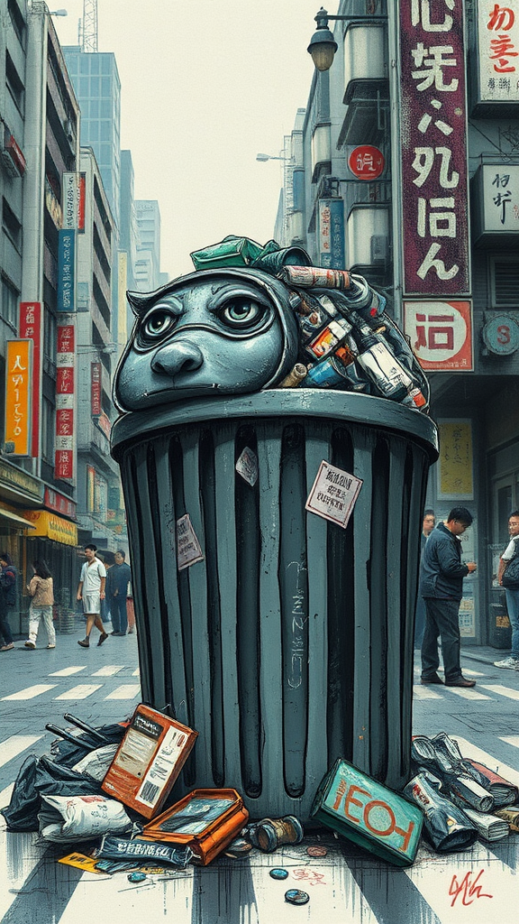 A distant view of an anthropomorphic trashcan in Tokyo, overflowing with garbage, rendered in the artistic styles of Yoshii Chie, Hikari Shimoda, and Martine Johanna. Intricate and detailed concept art with an ink sketch effect, using digital 2D techniques in a dark fantasy theme; the trashcan exhibits human-like features and a melancholic expression, surrounded by surreal Tokyo cityscape elements that are subtly distorted, with vibrant yet somber color tones blending into the urban backdrop.