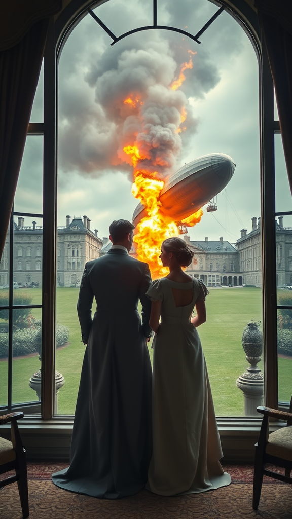 A distinguished couple, elegantly attired in the finest 1800s fashion, stands poised by their expansive window, surveying their magnificent estate. Their expressions are serene yet determined as they witness a dramatic event: a grand airship, ablaze and trailing thick smoke, descends onto their manicured lawn with a resounding explosion. Despite the chaos outside, the couple’s posture remains unflinching, exuding a grace and resilience emblematic of their inner strength. The juxtaposition of their regal composure against the fiery wreckage creates a striking tableau that captivates the imagination. The meticulous details of their period clothing and the opulent decor of the room add layers of richness, while the vibrant flames and swirling smoke infuse the scene with urgency and intensity. This vivid blend of historical elegance and dynamic action is a testament to the unyielding spirit of human resolve in the face of calamity.