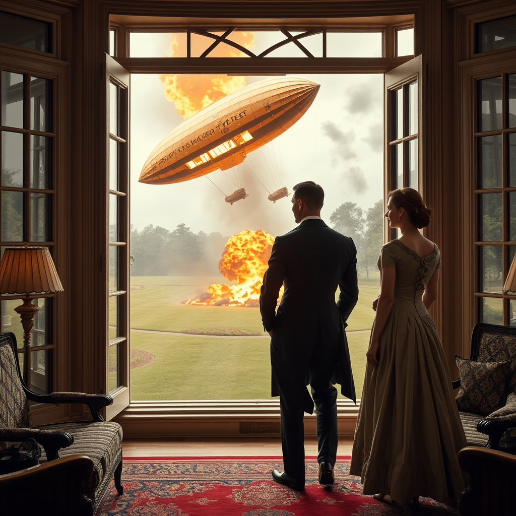 A distinguished couple, impeccably dressed in the fashion of the late 1800s, stands poised and resolute by the grand bay window of their opulent drawing room, surveying their sprawling estate. Their expressions are stoic yet commanding as they witness a disastrous spectacle: a magnificent hot air dirigible, engulfed in searing flames, plummeting toward the manicured expanse of their front lawn, culminating in a deafening explosion. Despite the chaos, their composed stance speaks of unyielding strength and determination, showcasing grace in the face of calamity. The juxtaposition of their regal calm against the backdrop of fiery havoc outside paints a dramatic and enthralling scene that captures the imagination and leaves a lasting impression. The finely detailed craftsmanship of their attire and the room's vintage elegance infuse depth and richness into the atmosphere, while the raging inferno and billowing smoke inject urgency and peril. The resulting tableau is a stunning fusion of historical splendor and dynamic action, celebrating the timeless resilience and courage of the human spirit confronting adversity.