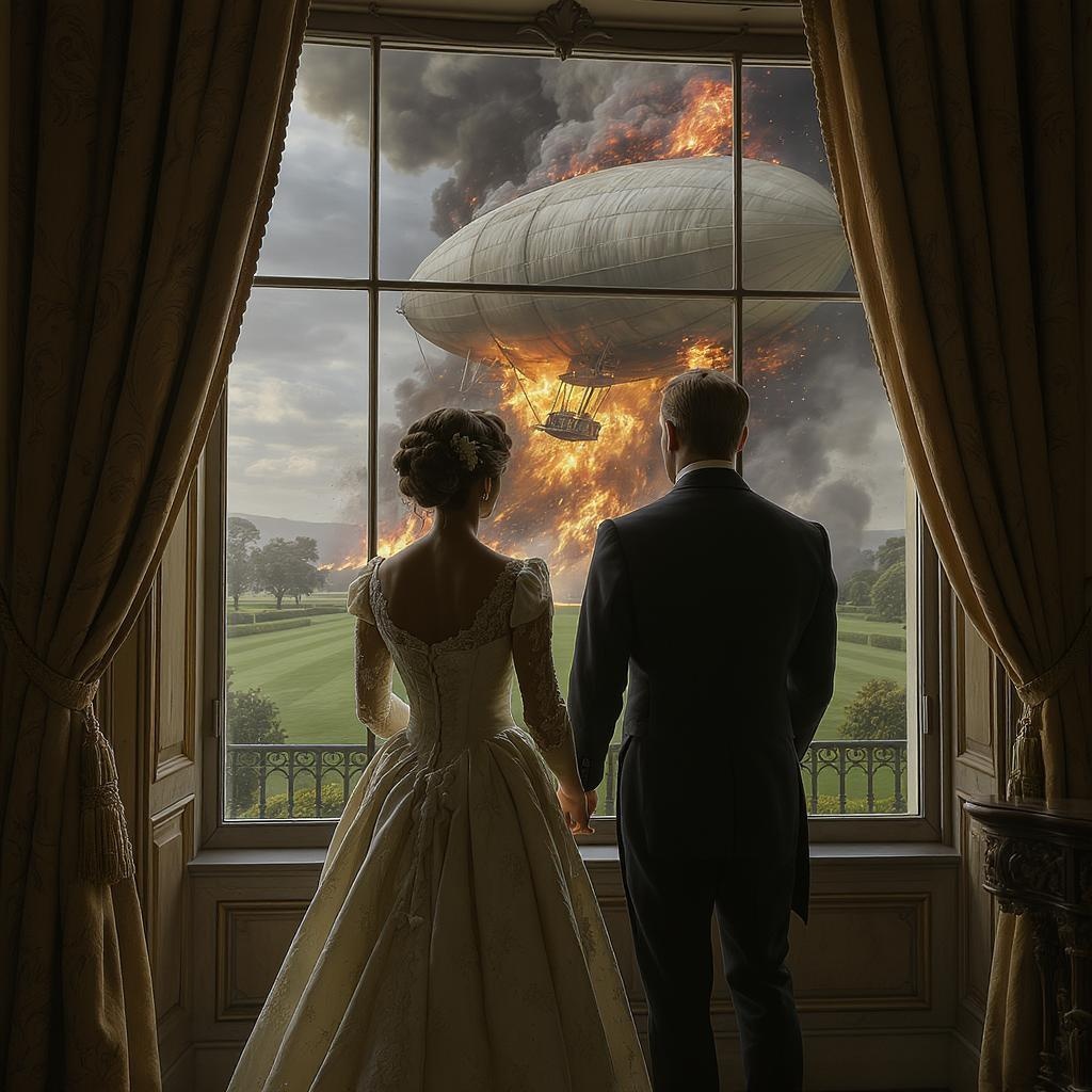 A distinguished couple, impeccably dressed in the finest fashion of the late 1800s, stands poised by their grand window, surveying their expansive estate with an air of unshakable confidence. Their expressions remain serene and composed as they observe a harrowing scene outside: a majestic airship, its canvas ablaze, plummets with a deafening roar onto their meticulously manicured lawn. Despite the chaos, the couple's stance remains elegant and assured, embodying a resolute strength and timeless poise. The juxtaposition of their refined demeanor against the fiery destruction creates a dramatic and captivating tableau. The intricacy of their attire, from the delicate lace of the lady's gown to the gentleman's tailored waistcoat, and the opulent vintage decor of the room add layers of depth and richness, while the billowing flames and smoke introduce a palpable sense of urgency and danger. This striking scene evokes a powerful blend of historical grace and dynamic intensity, paying tribute to the enduring spirit of humanity confronting adversity with dignity.