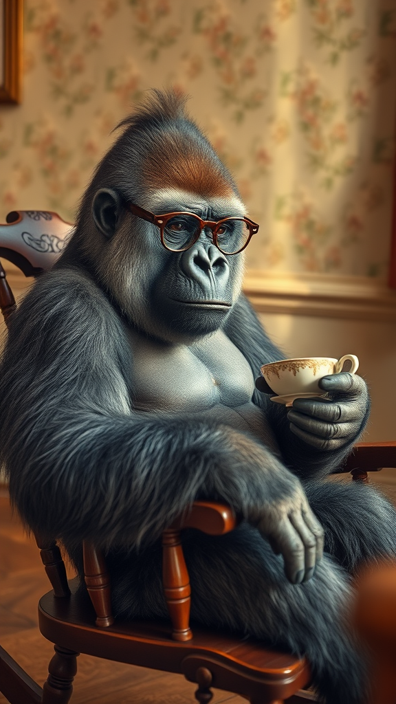 A distinguished gorilla with a hint of gray in its fur, sporting a neatly tied bun and wearing classic round spectacles, gently rocks in an antique wooden chair. The room is enveloped in soft floral wallpaper, casting a nostalgic charm. In one hand, the gorilla delicately holds a fine china teacup. The scene is bathed in a warm, golden light, creating a cozy, inviting atmosphere.