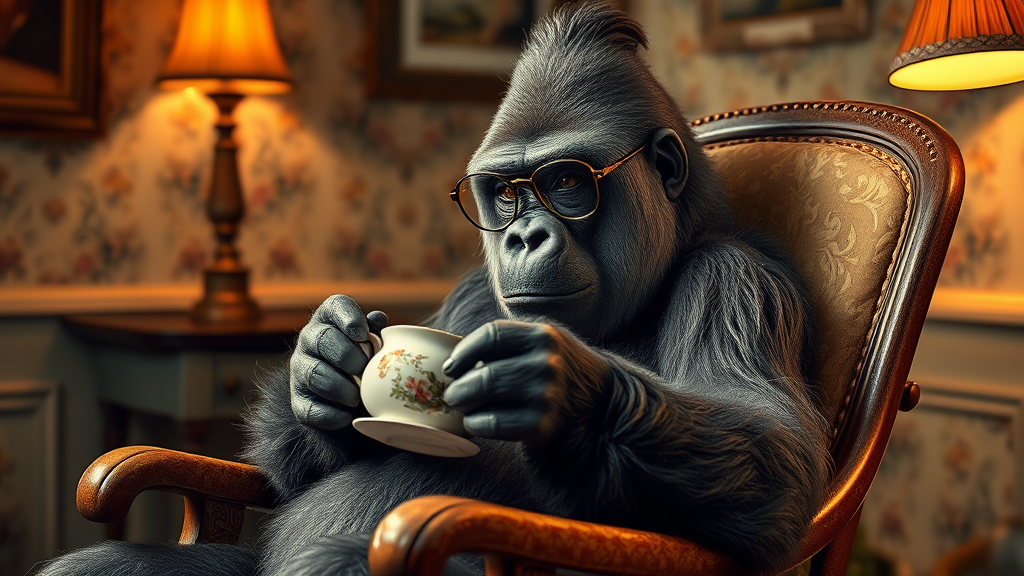 A distinguished gorilla with gray hair styled in a neat bun and wearing round spectacles sits comfortably in a vintage rocking chair. The gentle sway of the chair complements the cozy ambiance of a room adorned with elegant floral wallpaper. The gorilla delicately holds a fine china teacup, savoring the moment amid the soft glow of warm lights. The scene exudes a sense of tranquility and timeless charm, inviting a sense of ease and contemplative peace.