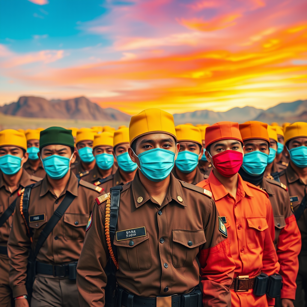 A diverse army of men from various ethnic backgrounds, each wearing identical vibrant masks reminiscent of Tyler the Creator's chromakopia aesthetic, captured in striking military photography. The soldiers march in unison, embodying the disciplined precision of Korean military formations, set against a backdrop of vivid colors and dynamic landscapes, creating a surreal yet cohesive visual harmony.
