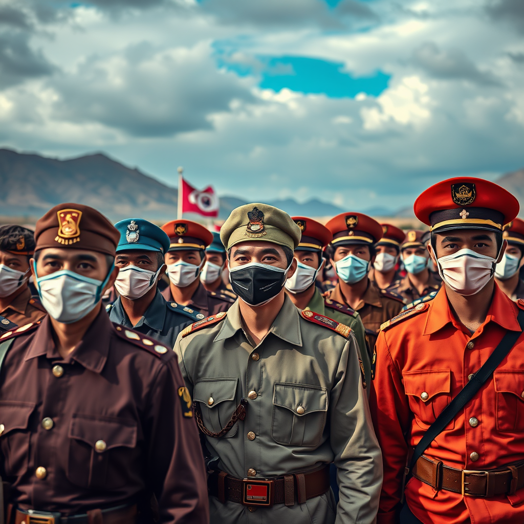 A diverse army of men from various ethnic backgrounds marches in unison, each wearing identical masks reminiscent of Tyler the Creator's Chromakopia, blending vibrant hues with a touch of surreal artistry, capturing the essence of unity and anonymity; the scene is infused with the disciplined precision and ceremonial grandeur reminiscent of Korean military parades, offering a striking visual of military regalia and synchronized movement, set against a backdrop of dramatic skies and dynamic landscapes.