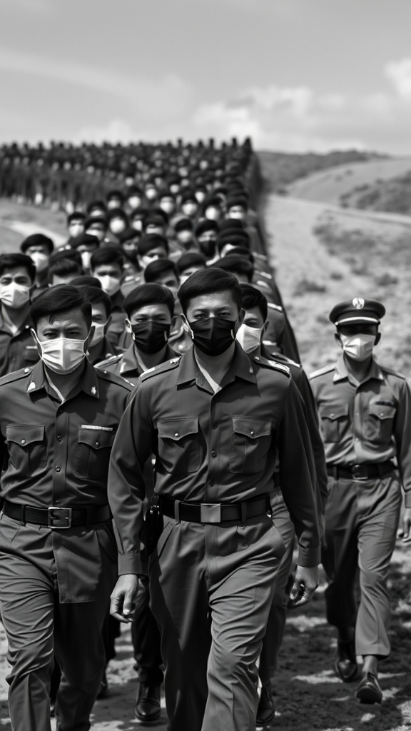 A diverse army of men representing various ethnicities, all donning identical Chromakopia masks reminiscent of Tyler the Creator's aesthetic, march in unison with an aura of military precision. Their movements echo the disciplined strength found in Korean military formations, as they traverse a landscape bathed in the stark contrast of monochrome photography, each step resonating with unity and purpose in a captivating display of synchronized power.
