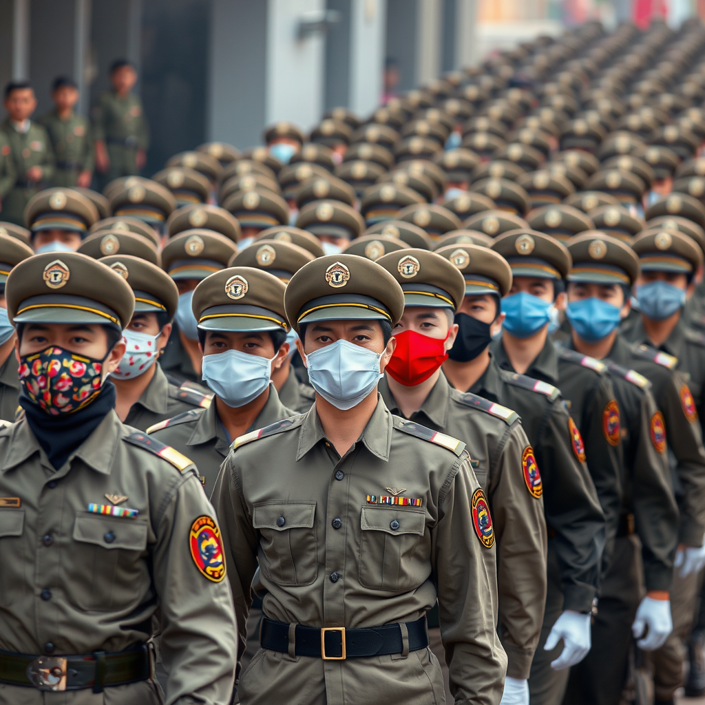 A diverse army of soldiers from various ethnic backgrounds, each wearing a uniform mask reminiscent of vibrant and surreal designs, marches in precise formation. The scene captures the discipline and unity of military photography, inspired by the regimentation of the Korean military. The masks' bold colors contrast sharply with the soldiers' austere uniforms, creating a striking visual juxtaposition as they move in unison, reflecting both individuality and collective strength.
