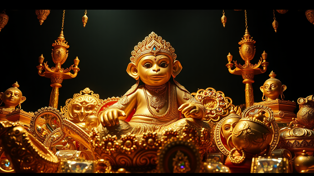 A divine golden monkey enshrined amidst a wealth of opulence, surrounded by shimmering treasures of gold, diamonds, and silver, set against a deep black background. This ultra-detailed and cinematic scene captures the surreal essence with hyper-realistic, 8k resolution, and the feel of a high-res octane render. The dramatic lighting enhances the photorealistic textures, delivering the visual impact of a DSLR shot through Unreal Engine 5, featuring mesmerizing cinematic lighting and an ultrarealistic finish. The entire composition is presented in an aspect ratio of 2:3, blending the boundaries between reality and fantasy with a god-like aura of richness.