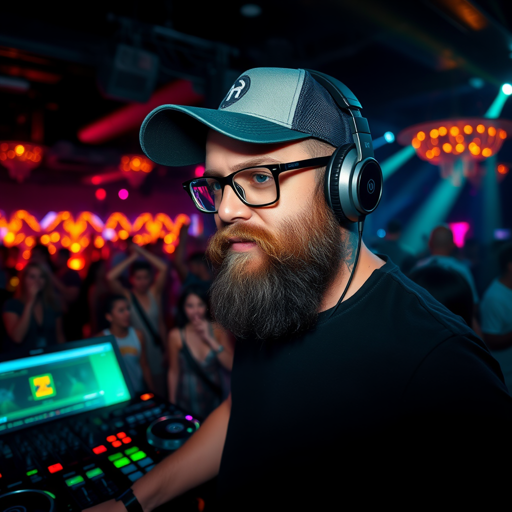 A DJ with a full beard and trendy glasses, sporting a stylish baseball cap and a sleek black T-shirt, immersed in the rhythm of a lively nightclub party. He wears oversized headphones, blending seamlessly with the pulsating beats and dazzling cinematic lights that illuminate the energetic crowd.