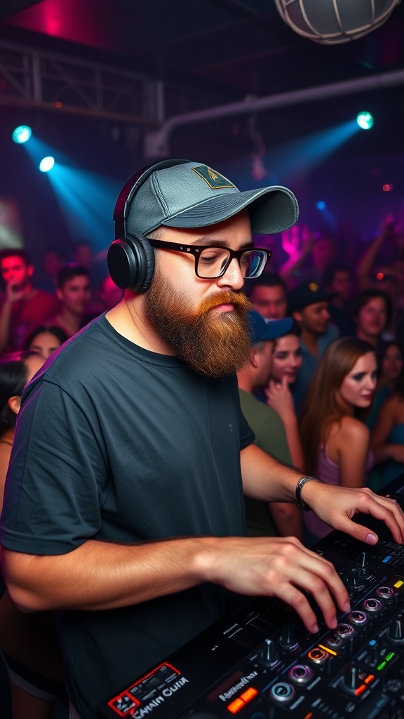 A DJ with a stylish beard and glasses sporting a baseball cap and a dark T-shirt, donning headphones, energizing a lively club scene filled with vibrant partygoers, as cinematic lights dance around.