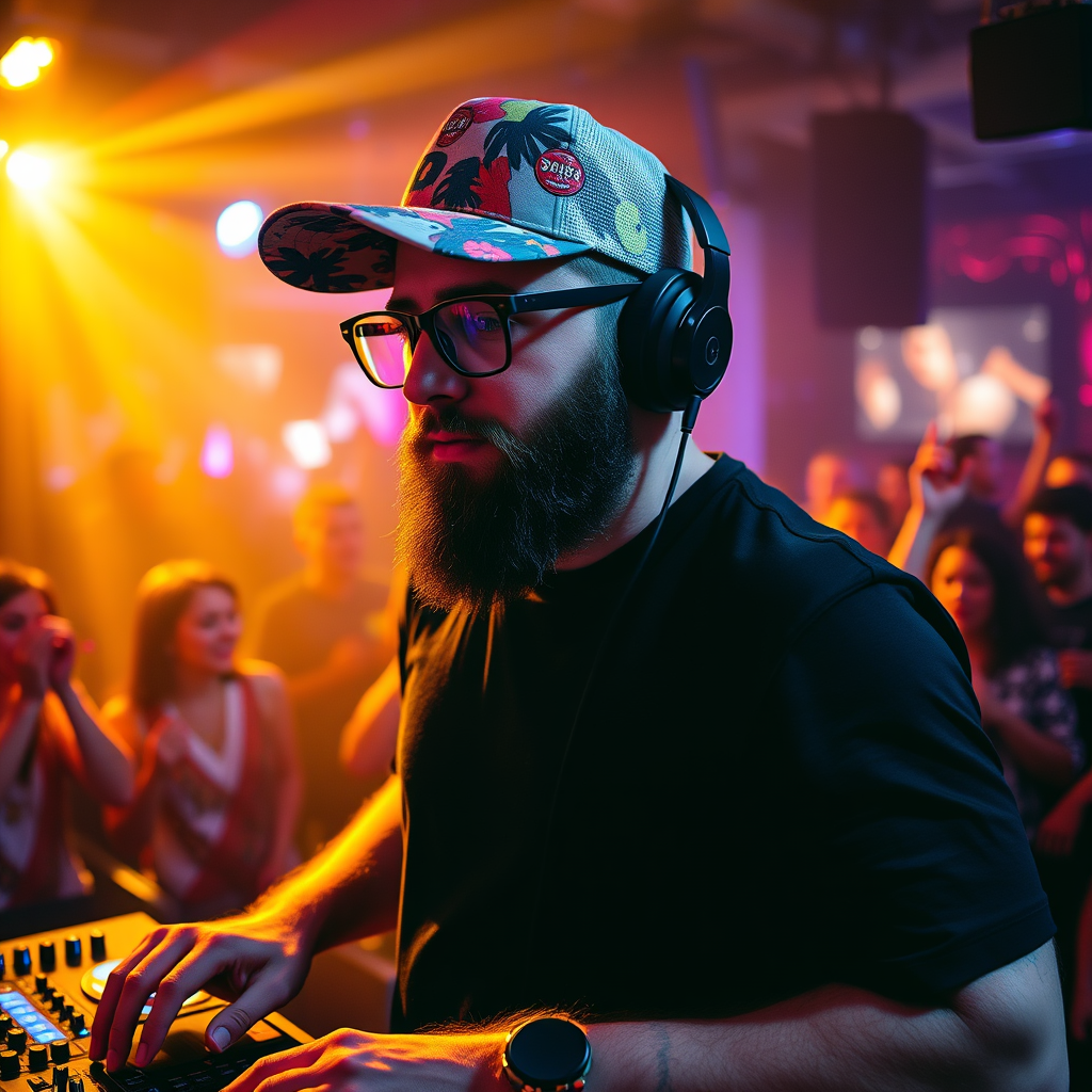 A DJ with a stylish beard and trendy glasses, sporting a colorful baseball cap and a sleek black T-shirt, energizing the crowd with his headphones on, at a lively nightclub with dynamic and cinematic lighting.
