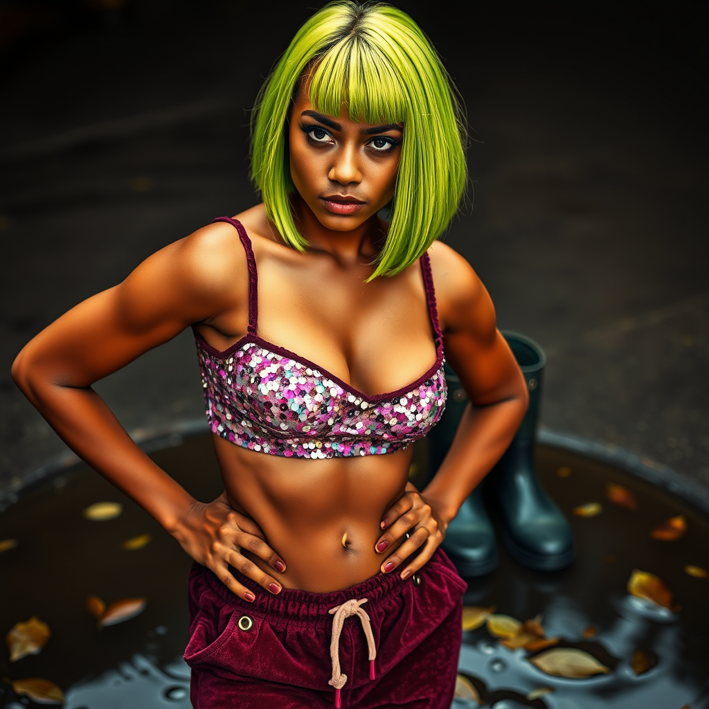 A documentary photograph captures a 24-year-old Maranao-Guarani female circus performer with a subtle yet playful defiance in her expression. Her body exhibits a tight, flat stomach with defined muscle grooves, toned muscles, abs, and a flat chest. Her golden brown skin radiates a gentle warmth, with visible skin pores and texture. Her deep-set grey cat eyes are framed by long, elegant eyelashes, while her bright lime green bob haircut with baby bangs complements her soft, gradient-shaped brows, highlighting her delicate facial features. She dons a sequin-embellished crop top that sparkles and shines, paired with low-rise velour tracksuit pants, showcasing a retro-inspired street style. Posed with her hands on her waist and leaning slightly to one side, she exudes an approachable and friendly aura from the left side of the image frame, adhering to the rule of thirds. In the background, a pair of rain boots stand in a puddle, adorned with floating leaves. The scene is softly illuminated by natural light, in the evocative style of Oskar Fischinger, adding an artistic touch to the moment.