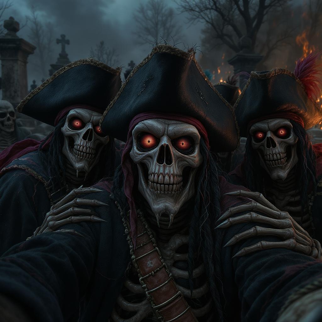A dramatic and cinematic selfie featuring a mixed group of skeletons and pirates in a chilling graveyard setting. The scene is dark and intensely detailed, with a vivid atmosphere that evokes fear and intrigue. The image showcases high-resolution features, 16k UHD and HDR quality, capturing the eerie essence of the moment. The characters are depicted with hauntingly deformed irises and pupils, lending an unsettling look to their eyes, some appearing cross-eyed. The pirates and skeletons possess cloned faces with peculiarities such as extra fingers and mutated hands. The composition hints at being cropped but retains its cinematic effect without low-resolution issues. The absence of text, signature, watermark, or artist identifiers presents an uninterrupted view into this spooky world. Certain elements seem out of frame, adding a mysterious depth, with a touch of surreal distortions like elongated necks, enhancing the unsettling, spine-tingling experience.
