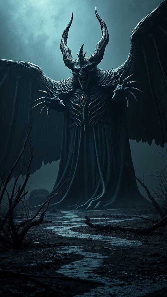 A dramatic and photorealistic glamour shot of Sauron, enveloped in a morbid and dark atmosphere with hyper-ornate details. Rendered in octane, the image captures a wet, dense ambiance, blending elements of epic fantasy with an eerie, empty landscape. Inspired by the works of John Tolkien, the scene is reminiscent of trail cam footage, with a haunting, creepy presence. Photographed as if seen through the lenses of Irakli Nadar and Reylia Slaby, capturing every intricate detail with a hyper-realistic approach. The composition is strikingly vertical, enhancing the towering and menacing aura of Sauron amidst an atmospheric and shadowy backdrop.