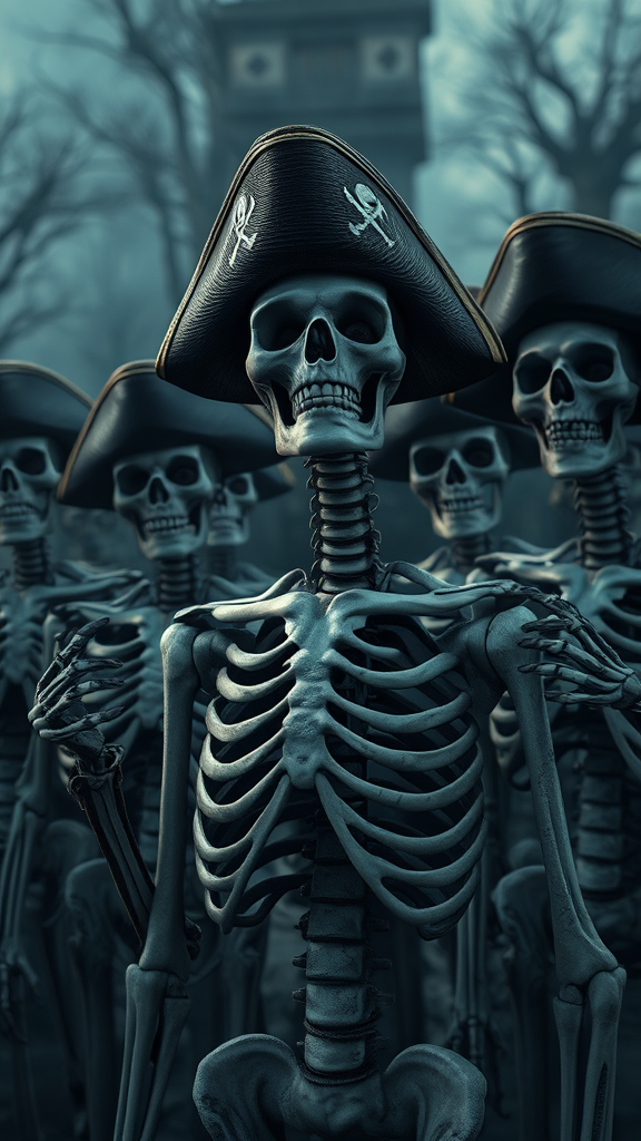 A dramatic and vivid scene featuring a group of skeletons posing with pirates in a creepy graveyard setting emerges, embodying a cinematic and intense atmosphere. The dark, eerie ambiance is heightened by extreme detail and 16k quality, showcasing a UHD, HDR look. The characters display an unsettling charm with deformed irises and pupils, creating a haunting and cross-eyed gaze. The scene is imbued with bizarre mutations like cloned faces, extra fingers, and oddly shaped hands, enhancing the frightening allure. Despite its eerie low-resolution artifacts, such as jpeg distortions and text remnants, the scene captivates without any hints of signatures, watermarks, or any identifiable artist marks. The composition, complete with a long neck and a slightly off-frame element, conveys a twisted yet creatively cohesive visual.