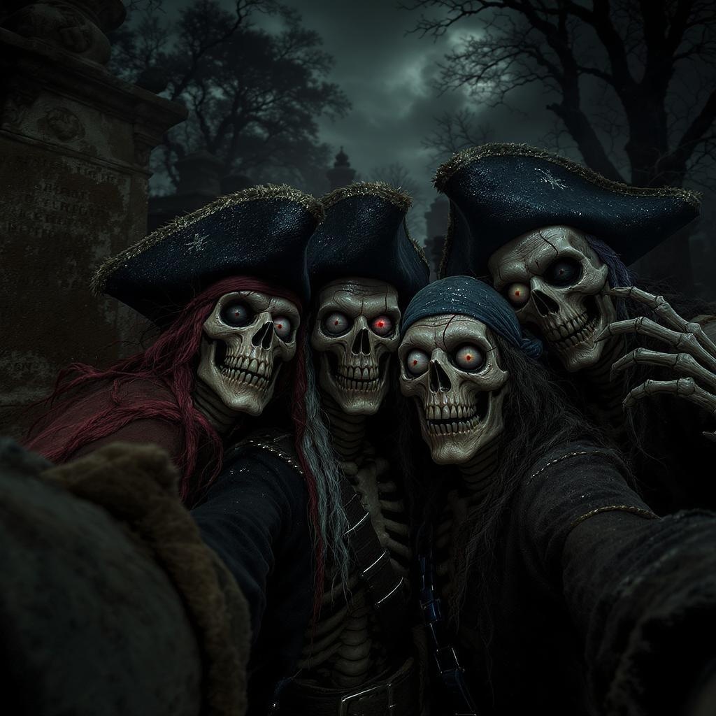 A dramatic and vivid scene set in a spooky graveyard featuring a group of skeletons and pirates posing for a selfie. The atmosphere is dark and intense, with cinematic lighting casting eerie shadows across the tombstones. The scene is rendered in extreme detail, showcasing every nuance in UHD and HDR, creating an immersive experience. The characters exhibit exaggerated features, such as deformed irises, pupils, and a cross-eyed appearance, with quirky elements like cloned faces and extra fingers adding an unsettling yet intriguing quality. Mutated hands and elongated necks contribute to the otherworldly vibe. Despite being cropped and low-resolution in some areas, the overall composition maintains its vivid depiction, capturing the essence of a haunting and mysterious moment without any distracting text, signatures, or watermarks.