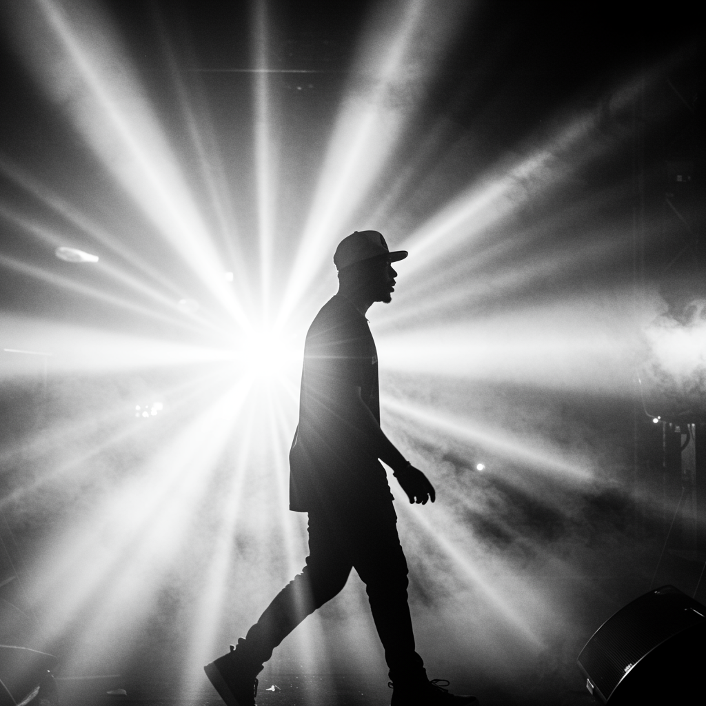 A dramatic black and white photograph captures a dynamic moment as a rapper in a baseball cap strides forward from a swirling mist on stage during a high-energy concert. The side view composition reveals the intensity and focus etched on the rapper's face, while volumetric lighting casts ethereal beams through the fog, accentuating his silhouette. The cinematic angle captures the grandeur of the performance, with bold lights cutting through the haze to create an electrifying atmosphere. Small creative adjustments play with shadow and contrast to emphasize the raw emotion and power of the moment.