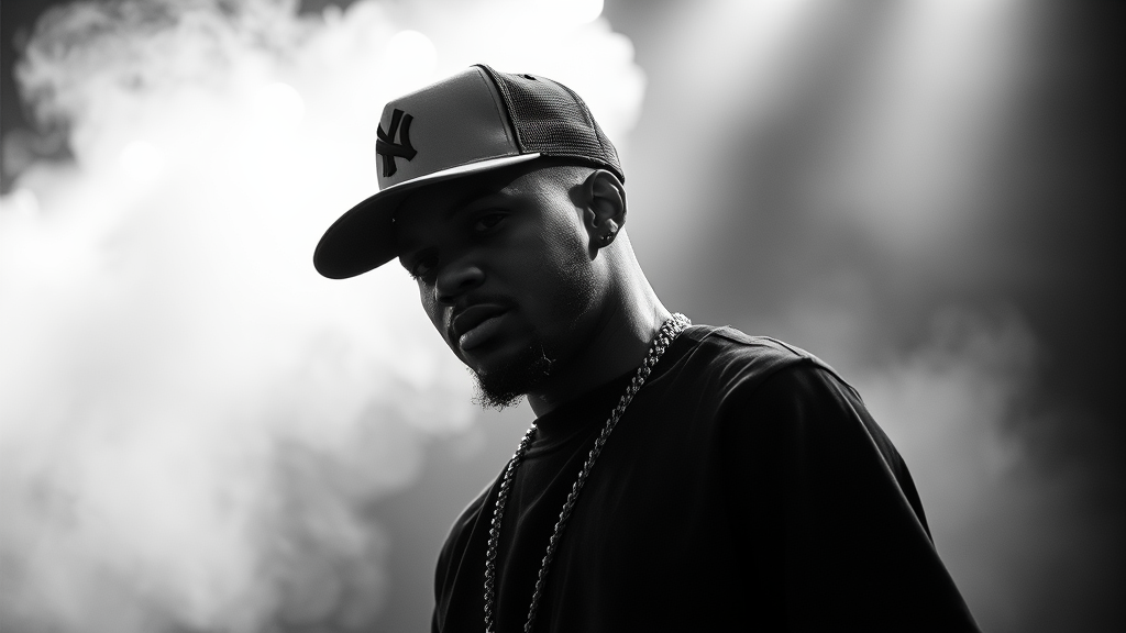 A dramatic black and white photograph captures a rapper in a stylish baseball cap emerging from a sea of fog on stage during an electrifying concert. Taken from a dynamic side angle, the image is enhanced by volumetric lighting that creates an ethereal glow around the performer. Cinematic lights frame the scene, highlighting the intensity and energy of the moment, while shadows dance across the rapper's focused expression and confident stance.