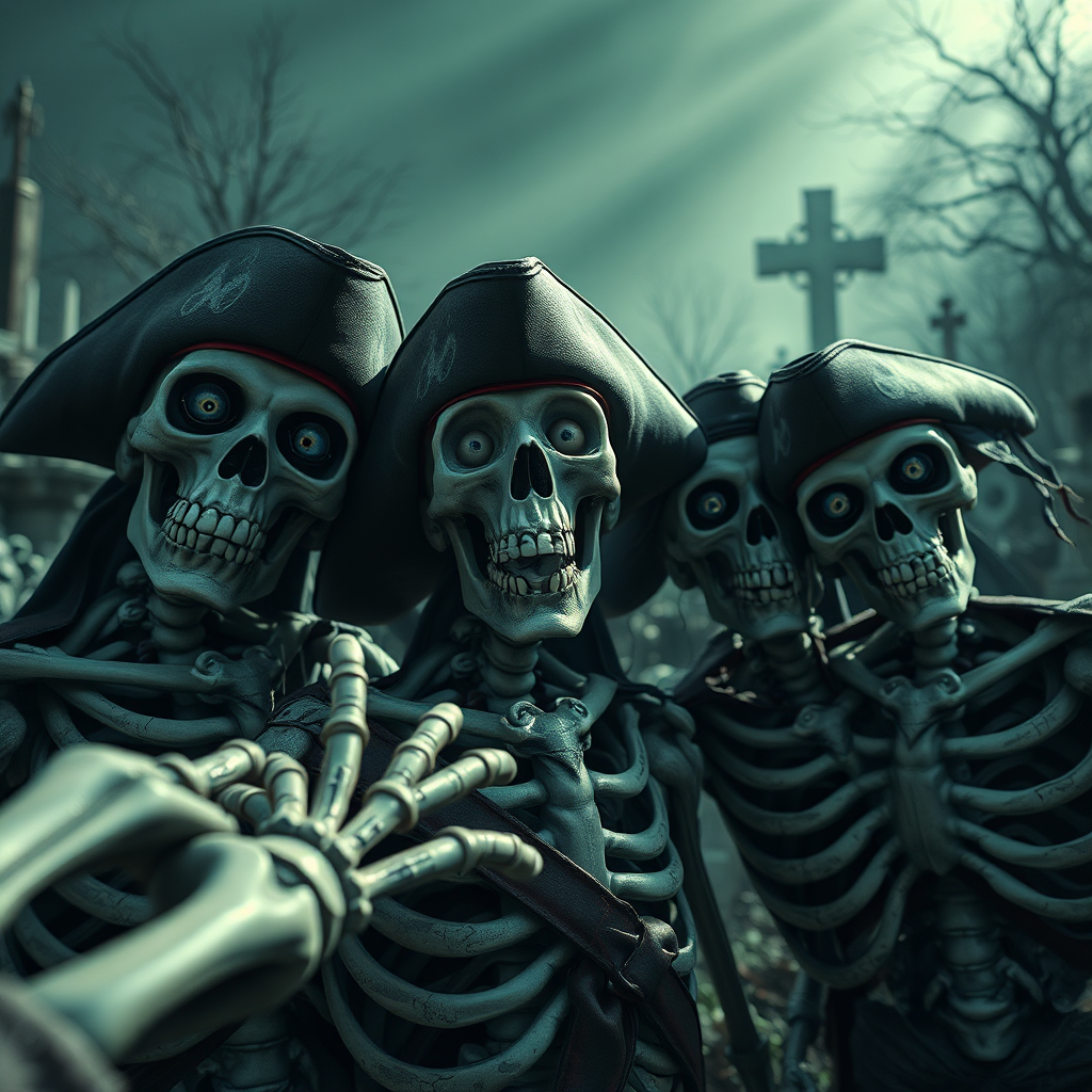 A dramatic, cinematic graveyard scene featuring a group of skeletons and pirates taking a selfie. The atmosphere is dark and scary, with extreme detail and vivid, intense elements that capture the eerie vibe. The image is rendered in 16k UHD with HDR, showcasing the chilling environment. The characters have deformed irises and pupils, creating a haunting cross-eyed appearance. Their faces show subtle yet unsettling cloning effects with extra fingers and mutated hands adding to the macabre feel. The scene is cropped to enhance the focus but deliberately avoids low resolution and common digital issues like text, jpeg artifacts, or watermarks. The background features long shadows and a mysterious, out-of-frame ambiance that intensifies the spooky setting.