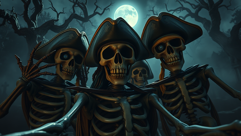 A dramatic cinematic selfie featuring a group of skeletons and pirates in a graveyard under the eerie glow of moonlight, creating a vivid and intense atmosphere with extreme detail in 16k UHD HDR. The scene is dark and scary, set amid tombstones and mist, with twisted gnarled trees casting shadows. The skeletons and pirates have hauntingly deformed eyes with strange irises and pupils, adding to the unsettling feel. Some figures have extra fingers or mutated hands, enhancing the sinister vibe. The composition avoids common digital flaws like cropped views, low resolution, text, jpeg artifacts, or any signatures. There's a sense of mystery as one pirate's face is eerily mirrored. Despite these peculiarities, the image exudes a spooky charm, capturing a moment frozen in time with otherworldly detail.