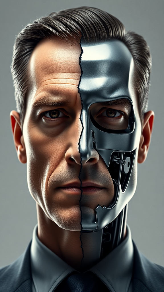 A dramatic, front-facing close-up portrait of Mariano Rajoy in a suit, reminiscent of the T-1000 from Terminator 2. The composition is perfectly symmetrical, with his face divided vertically into two distinct visual styles. The left half showcases hyper-realistic details, emphasizing lifelike skin textures, prominent cheekbones, and intense, focused eyes under cinematic lighting that accentuates his commanding and authoritative presence. The right half is a seamless transition to a liquid metal form — sleek, reflective, and subtly shifting — evoking a futuristic, shape-shifting entity. His expression remains serene, composed, and exudes an air of quiet menace and unwavering focus. The division between the two halves is jagged and organic, resembling torn steel or cracked ice, symbolizing the integration of human essence with advanced technology. A subdued, minimal background keeps all focus on his iconic, intimidating visage, highlighting the dramatic contrast between man and machine.