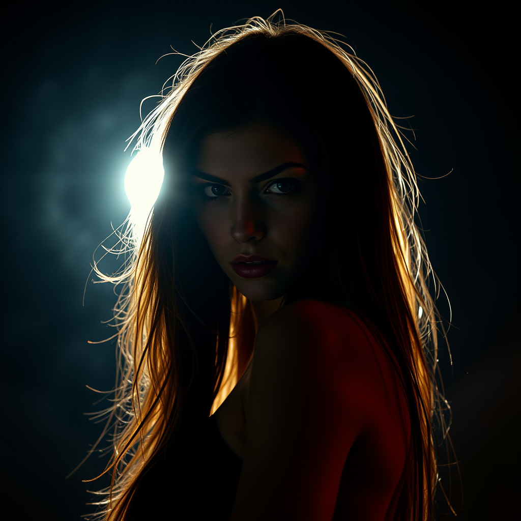A dramatic portrait featuring a stunningly beautiful 30-year-old woman with a slender athletic build and an alluring face. Her expression is a mix of frowning intensity and innocence, framed by her luxuriant hair. The oppressive and contrasting backdrop enhances the mood, with backlighting that creates a striking silhouette against the dark, atmospheric setting. Gloomy and horrific elements in the background amplify the cinematic drama. Photographed from a low angle with a DSLR, the shot features an aperture setting of f/7, a shutter speed of 1/100 sec, and ISO 150, capturing every detail in hyper-realistic clarity. The cinematic lighting casts natural reflections, highlighting the textures with a bright, almost blinding light. The composition is both dynamic and symmetrical, avoiding any distortions or unnatural features, and emphasizes elegance and poise. The woman's appearance and surroundings are crafted to convey depth and emotion, bringing a compelling narrative to the visual masterpiece.