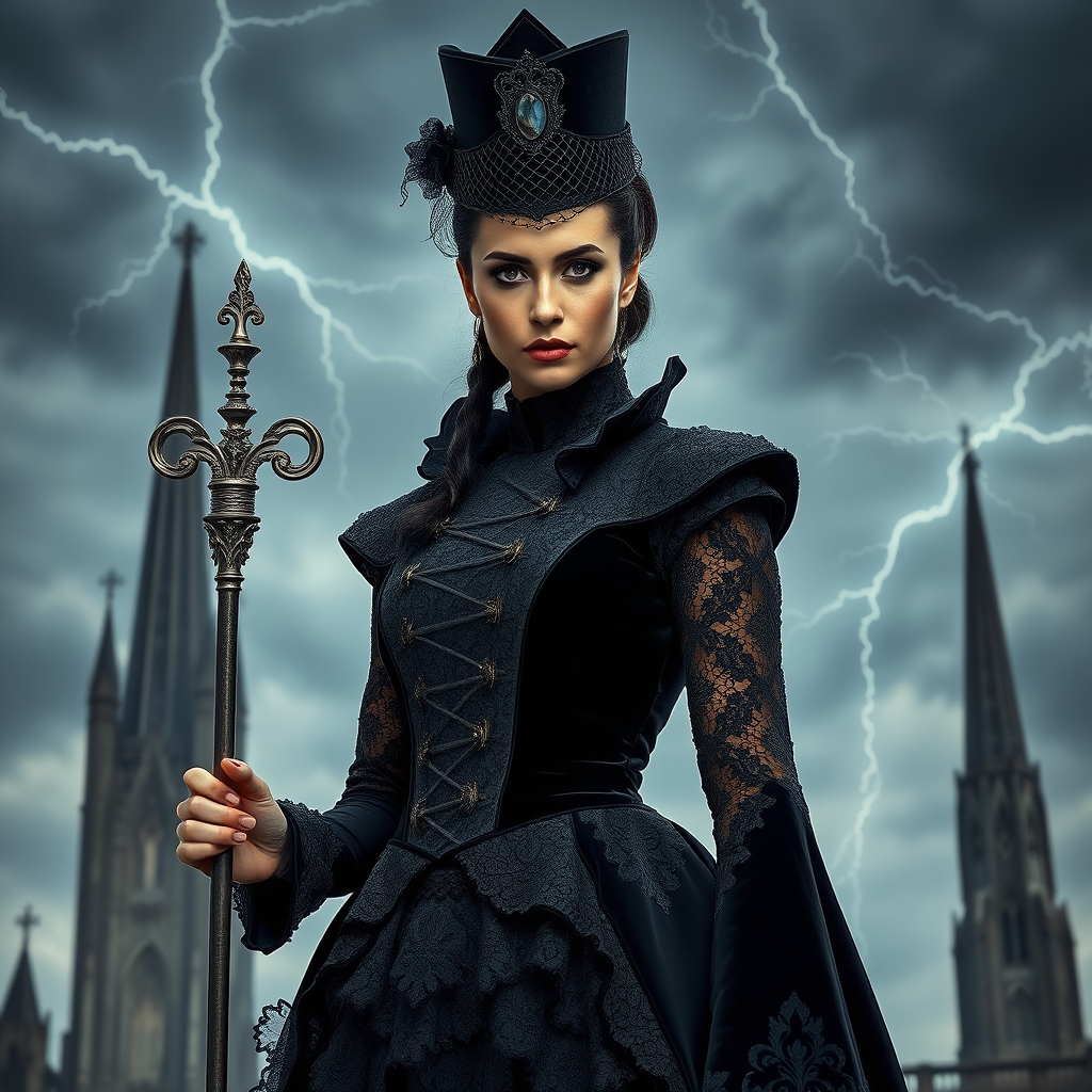 A dramatic portrait of a commanding woman, her gaze steady and piercing, eyes deep and mesmerizing. She poses in an elegant, Gothic-inspired gown crafted from dark velvet and intricate lace. The gown is adorned with angular designs, ornate metal clasps, and cascading layers of inky black fabric. Her tall, pointed hat features delicate veiling, while her dark hair is styled meticulously into a tight, severe bun. In her hand, she holds a long, ornate silver scepter, and her expression is serious and authoritative. The backdrop is a tumultuous sky with lightning streaks, set against towering gothic spires, amplifying the dramatic and powerful essence of the portrait.