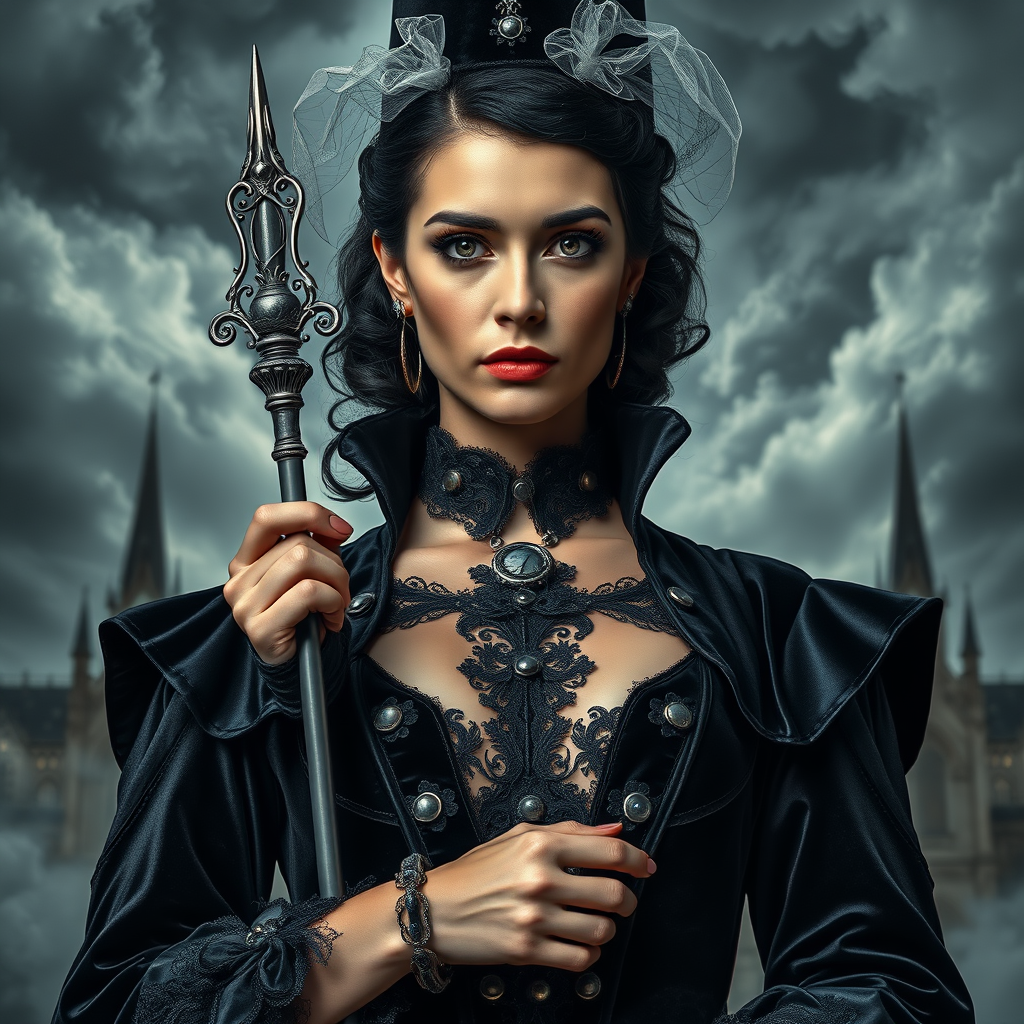 A dramatic portrait of a commanding woman, her gaze unflinching, her eyes deep and piercing, dressed in a Gothic-inspired gown with luxurious dark velvet and intricate lace accents. The gown features angular cuts, ornate metal fastenings, and cascading layers of midnight fabric. She wears a tall, pointed hat adorned with delicate veils, while her dark hair is impeccably styled in a tight, severe bun. In her hand, she grasps a slender, silver scepter, her expression both intense and authoritative. Behind her, a backdrop of swirling, tempestuous skies and looming, gothic spires intensifies the dramatic and powerful essence of the portrait.