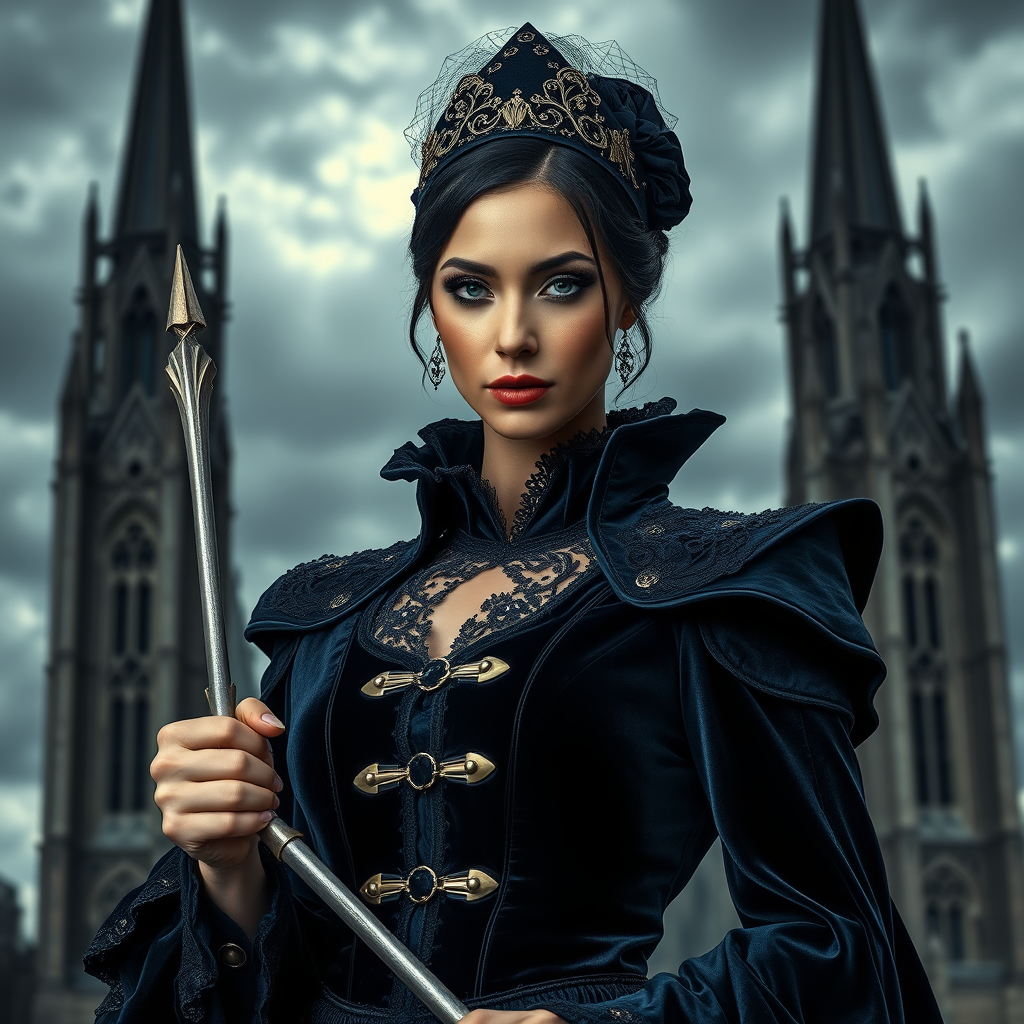 A dramatic portrait of a formidable woman, her gaze unwavering, her eyes deep and intense, posing in a structured, Gothic-inspired gown with sumptuous velvet and lace embellishments. The dress boasts sharp angles, intricate brass clasps, and cascading layers of midnight-blue fabric. The model wears an elegant, pointed headdress adorned with delicate veiling, and her dark hair is styled into a severe, tight bun. She holds a long, gleaming silver scepter, and her expression is a mixture of solemnity and authority. The background features a tempestuous sky and towering, gothic spires, heightening the dramatic and powerful essence of the portrait.