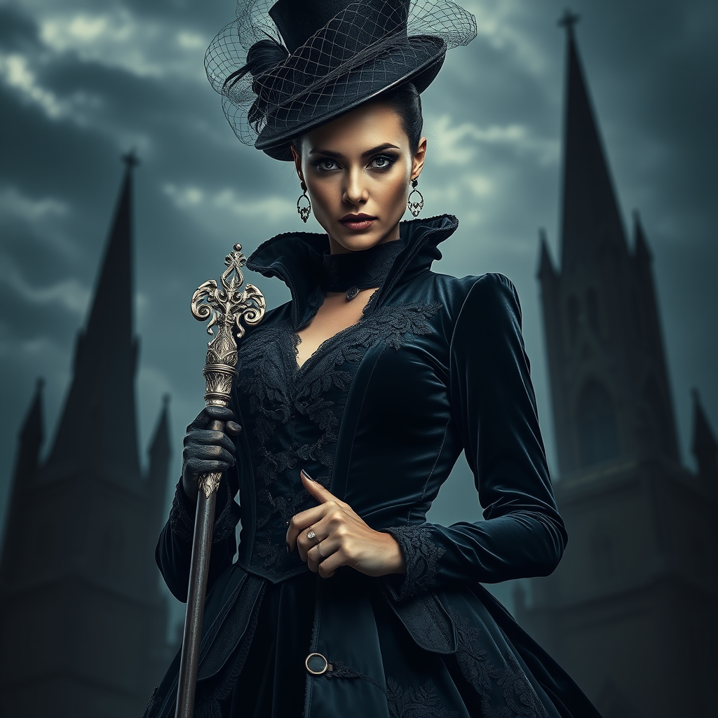 A dramatic portrait of a formidable woman, her gaze steady and piercing, eyes dark and captivating. She poses in a Gothic-inspired gown crafted from deep, sumptuous velvet and delicate lace accents. The dress boasts sharp lines, ornate metal fastenings, and cascading layers of midnight fabric. Atop her head sits a tall, conical hat adorned with intricate veiling, her ebony hair pulled into a sleek, unyielding bun. She grips a slender, ornate silver staff, her expression both authoritative and enigmatic. Behind her looms a tempestuous sky and towering gothic spires, amplifying the intensity and grandeur of the scene.