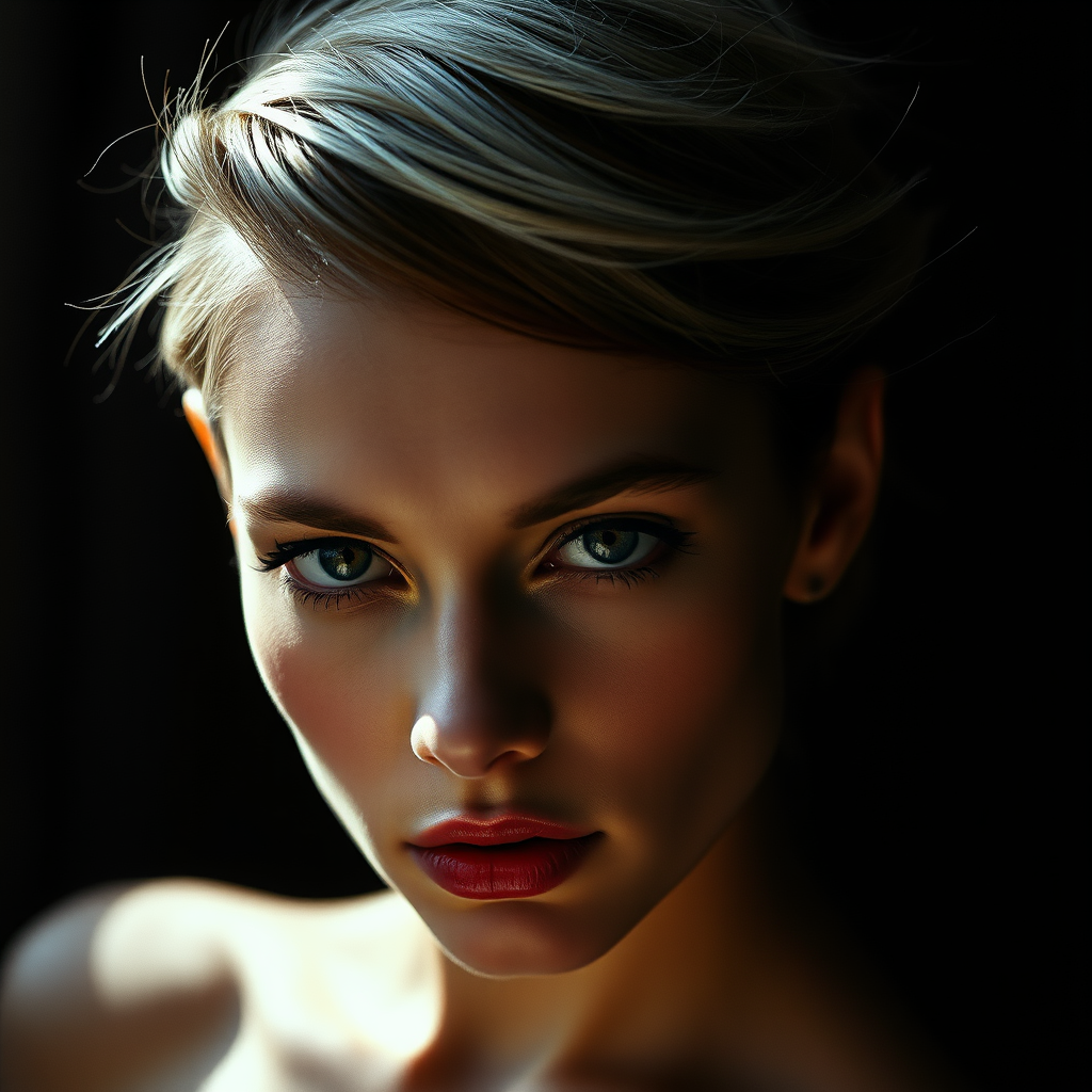 A dramatic portrait of a young woman with a chic, asymmetrical hairstyle and intense, captivating eyes. The image is captured in a high-contrast manner, with pronounced shadows and striking highlights that accentuate the model's defined features. Shot on film with a fast prime lens, the portrait possesses a gritty, textured quality that adds to its raw authenticity. This image is ideal for fashion editorials, advertising campaigns, or as a bold statement piece in art collections.